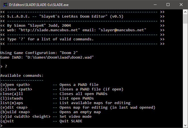 Before any editing you would need to use a command line interface to open a wad file, then in the editor any property modification was done using custom-drawn text menus - it was pretty unnecessarily clunky to use.