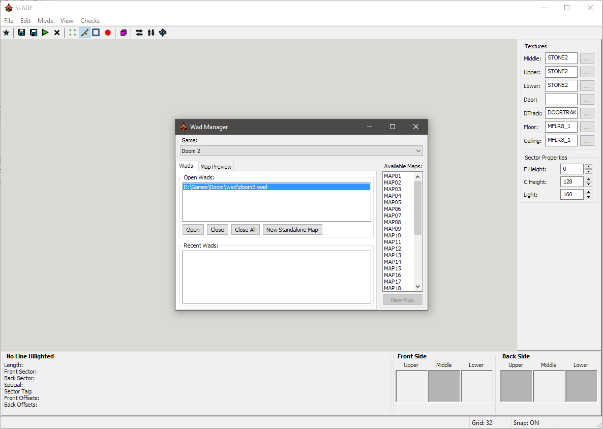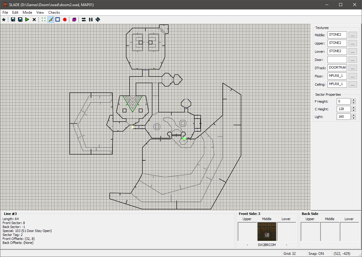 After v1.13 I ended up deciding to rewrite SLADE yet again, for some reason I don't actually remember. The rewrite improved many things with the editor, speed in particular, as well as adding pk3/zip support. It also featured advanced line drawing capabilities, allowing lines to be drawn crossing or overlapping other lines while still creating correct sectors, which no other editor could do at the time.