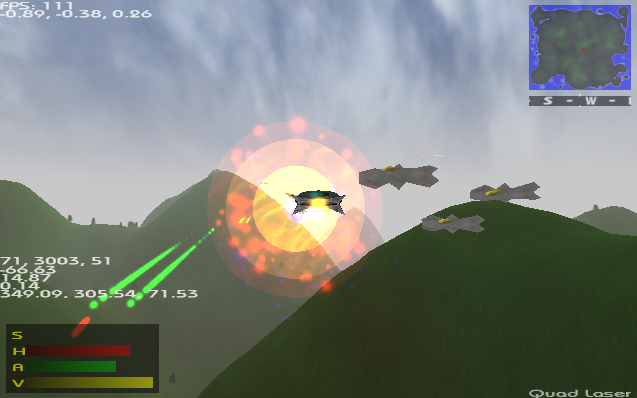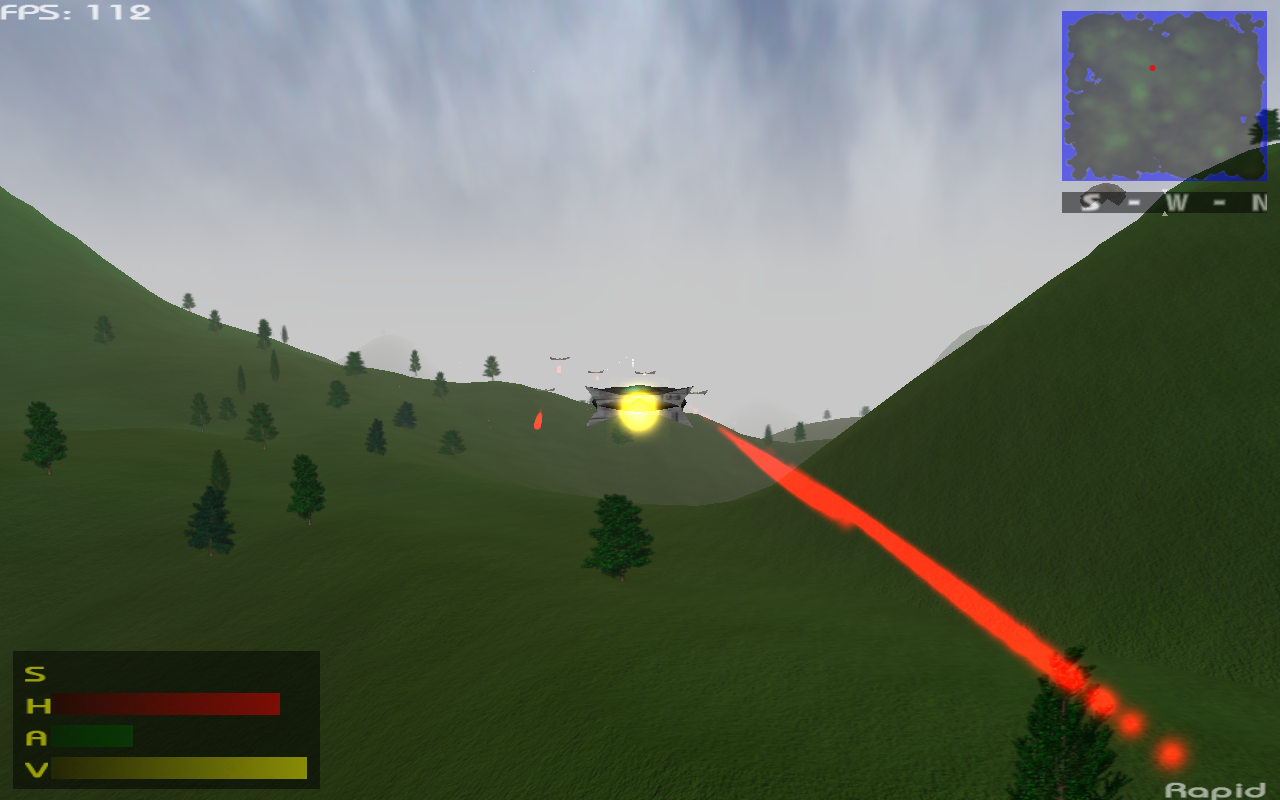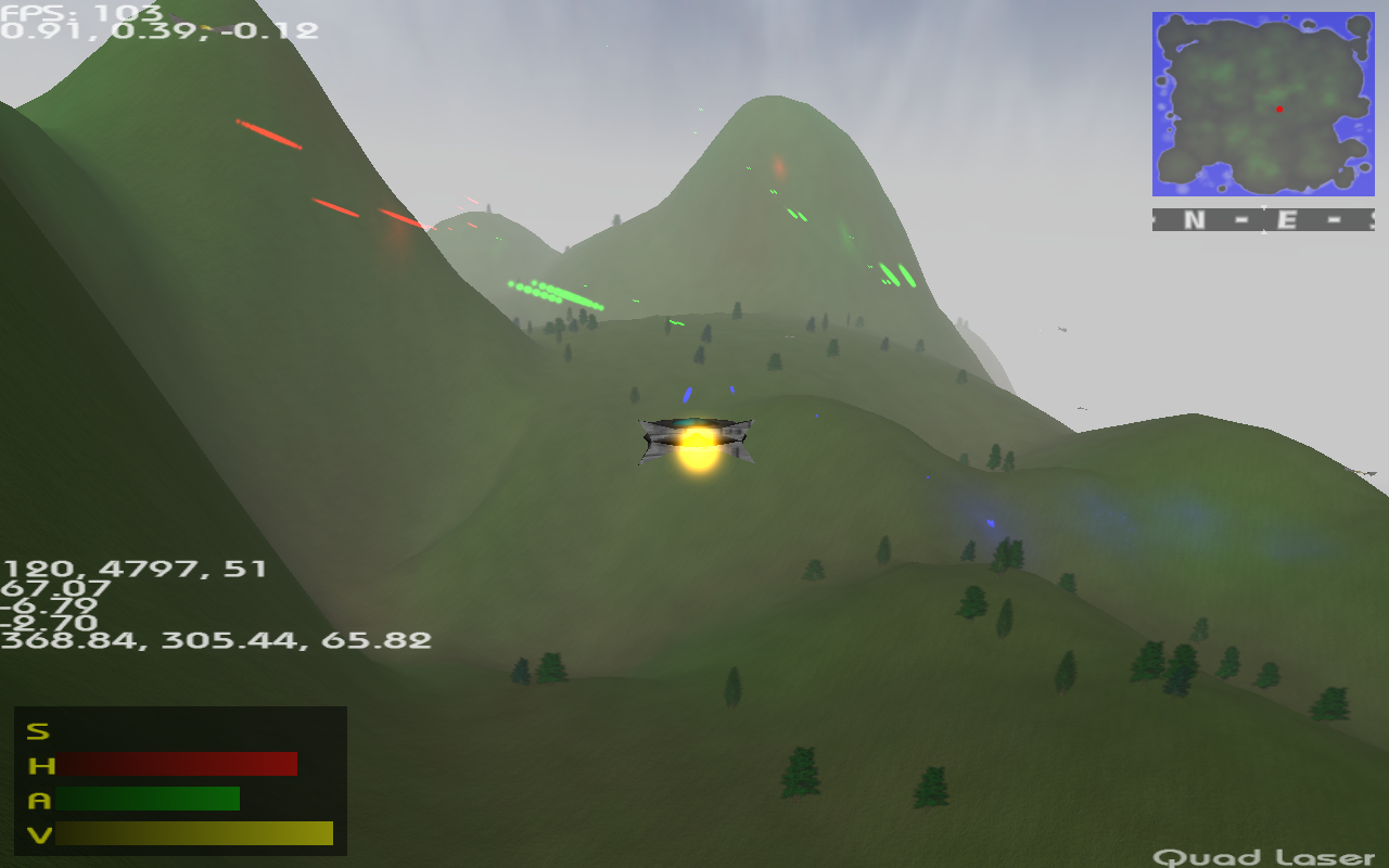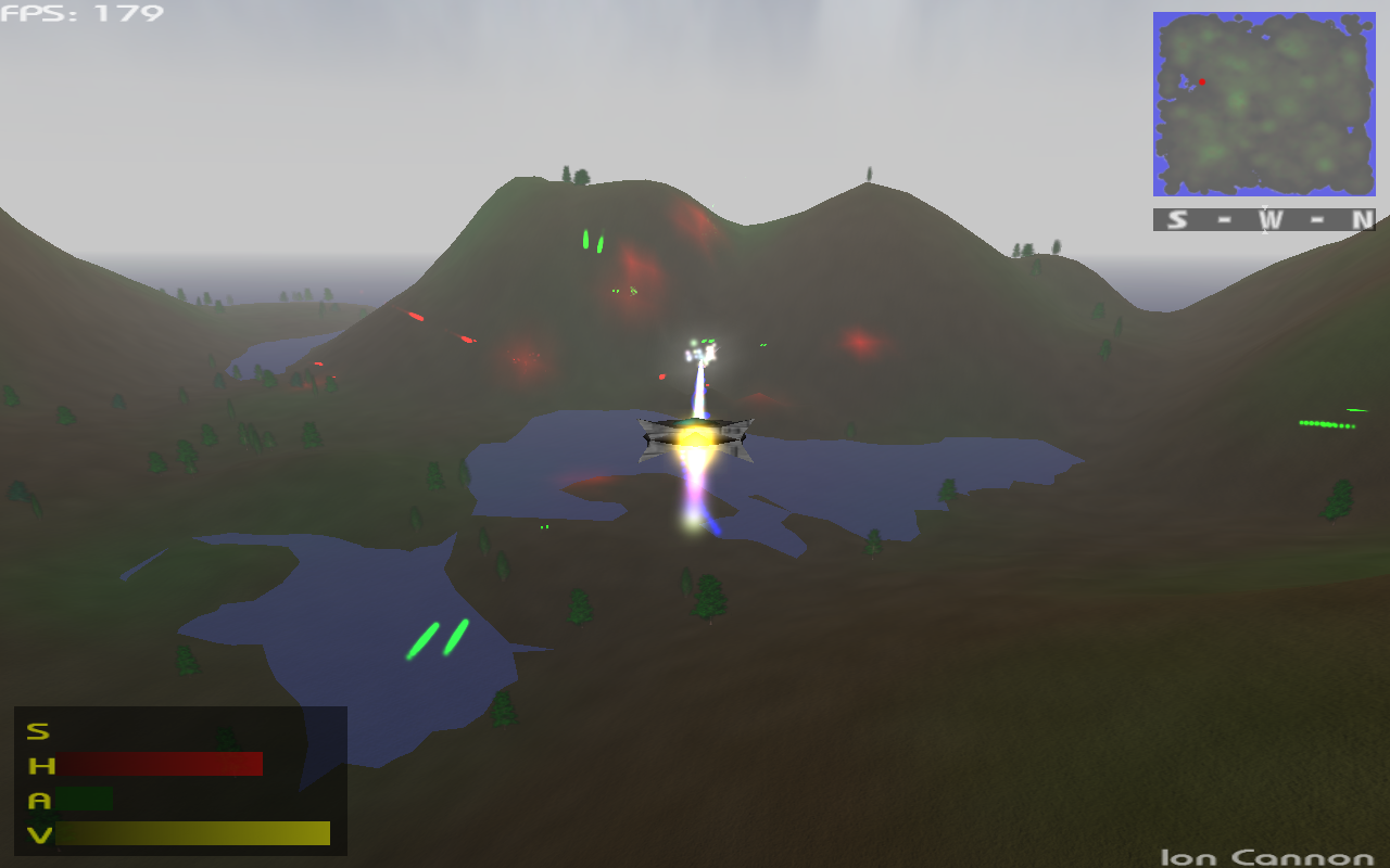 The engine itself featured some basic procedural terrain generation and tree placement, water & skybox, simple vertex-based dynamic lighting and a basic particle system, among other things. Gameplay wise you would control your ship in a similar fashion to Terminal Velocity, with access to various weapons, etc. I also implemented enemy ships with some very basic AI which you could shoot down. That is about the extent of the gameplay I ended up implementing.